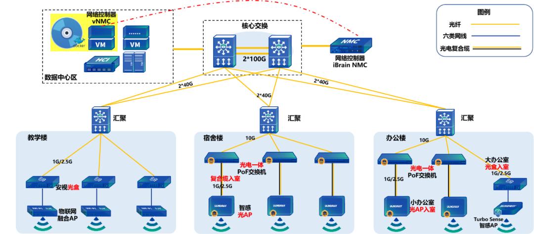 信锐全光4.0组网能实现核心100G,骨干40G的高带宽,采用光电一体化PoF接入,满足光AP的集中供电。网络控制器替代无线AC实现有线无线物联网统一管理,此外,控制器还可实现纯软件,配置管理更灵活、更稳定。为了适配各个场景,信锐全光4.0也针对使用场景进行了方案的个性化设计,推出了以下几种基于全光4.0的场景化解决方案。