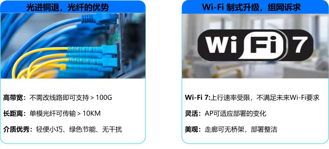 信锐全光4.0方案采用标准光电一体化接口,可做到一次接线,且部署整洁美观,和传统网线一致。