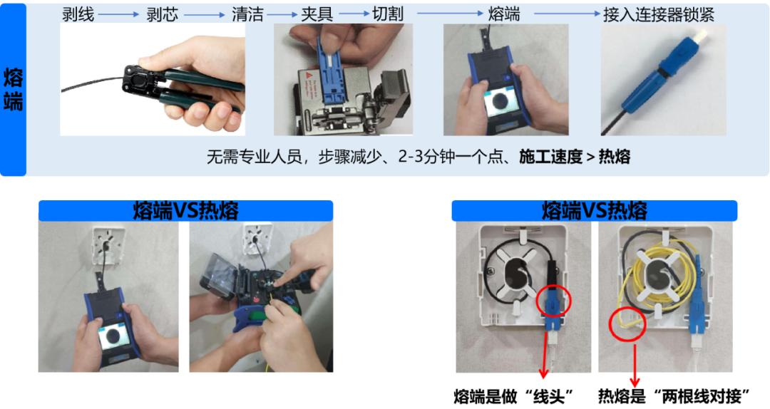 对比传统热熔方式,全光4.0采用的熔端方式和冷接方式的步骤相近,极大地降低了施工难度,能实现2-3分钟完成一个点位部署。与此同时,相对冷接,熔端的成功率和长期使用可靠性要更强。