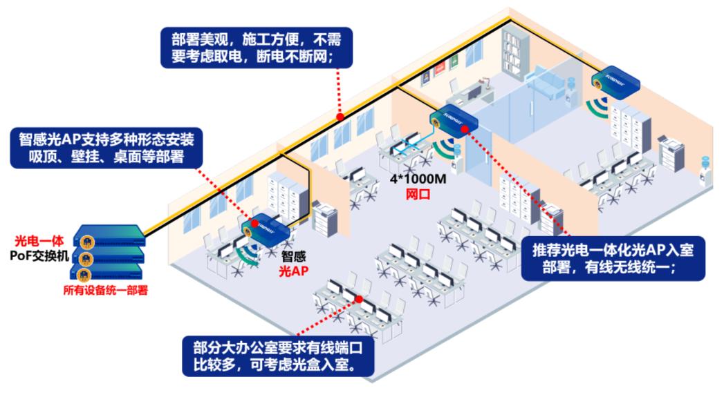 办公楼内走线部署美观,施工方便,不需要考虑就近取电。信锐4.0智感光AP支持多种形态安装吸顶、壁挂、桌面等多形态部署,满足不同办公室场景。该场景方案采用光电一体化光AP入室部署,AP自带4个1000M网口,可做到有线无线统一接入。
