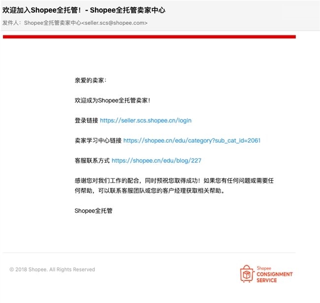 若审核通过,您将收到一封《欢迎加入Shopee全托管-Shopee全托管卖家中心》邮件,内含登录链接、卖家学习中心链接和客服联系方式,即表示您入驻成功,可进行后续的提品备货流程。
