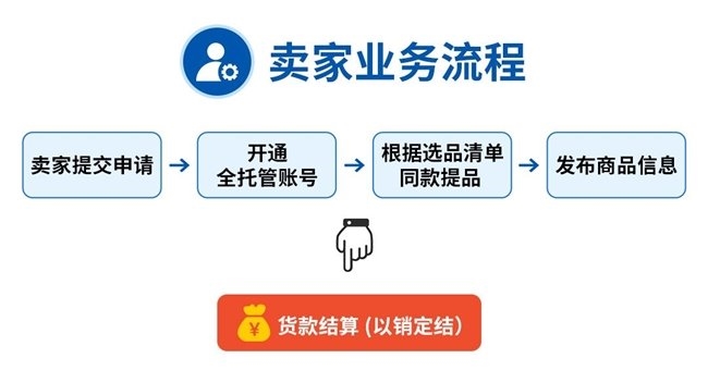 卖家只需专注货品,根据平台的《Shopee全托管爆品选品清单》进行同款提品,发布商品、积极响应后台备货安排,即可等待货款结算(以销定结)。